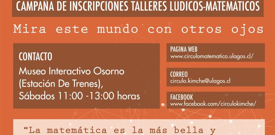 El Cïrculo Matemático Kimche es una organización que nace de la iniciativa entre academicos y estudiantes de la carrera de pedagogia en matemáticas y computación a mediados del 2017, año en que se establecen relaciones de colaboración entre otras con el Museo Interactivo de Osorno con quienes hemos establecido como punto de encuentro las dependencias del Museo, esto se traduce en la realización de un Taller lúdico-Matemático en que particpan estudiantes de educación media de distintos colegios ynliceos de la comuna de Osorno. Hay una serie de metas que el equipo que esta tras iniciativa espera cumplir este año, entre las que desataca publicar las experiencias a lo largo de estos años, como el primer cÃrculo matemática de Chile, y uno de los primeros de latinoamerica!