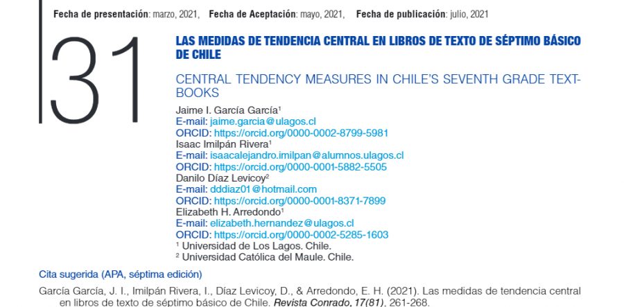 Resumen: En este estudio se analizan las actividades relacio-nadas con las medidas de tendencia central (MTC) propuestas en tres libros de texto de séptimo básico en Chile, dos emitidos por el Ministerio de Educación (MINEDUC) y otro por la editorial Santillana. Para tal propósito, se siguió una metodología cualitativa, de tipo descriptiva, mediante un análisis de contenido, considerando las siguientes unidades de estudio: tipo de MTC, tipo de tarea, forma de representación de datos, forma de mención y forma de trabajo. En general, los resultados evidencian el predominio de la media, la tarea de calcular la MTC, representación de datos a través de un listado de datos, mención directa y forma de trabajo individual. Este estudio servirá como base para ampliar el análisis de libros de textos de Educación Básica, y dar muestra del tipo de actividades relacionadas con las MTC que se proponen en séptimo básico en Chile.
