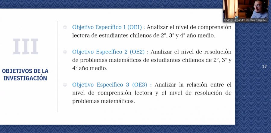 Durante esta semana se está desarrollando de manera virtual 6º Encuentro de Estudiantes Tesistas en Educación Matemática” (6° E2TEM), instancia académica en que participan los estudiantes Patricia Barrientos y Rodrigo Gonzalez  presentando avances de su investigación RELACIÓN ENTRE EL NIVEL DE COMPRENSIÓN LECTORA Y EL NIVEL DE RESOLUCIÓN DE PROBLEMAS MATEMÁTICOS DE ESTUDIANTES CHILENOS DE EDUCACIÓN MEDIA bajo el patrocinio del Dr. Jaime Garcia G.