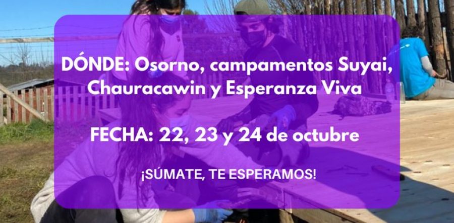 Durante este fin de semana pasado las estudiantes Antonia Barrientos y Fernanda Cardenas tomaron parte del trabajo voluntario ‘Construcción de Sedes’ que se realizó entre el viernes 22 y domingo 24 de Octubre en los campamentos Suyai, Chauracawin y Esperanza Viva. En palabras de Antonia y Fernanda esta acción significó para ellas un ‘bonita y significativa experiencia’ donde compartieron junto a otros y otras voluntarias, y pobladores de estas comunidades. Ellas esperan continuar este trabajo solidario invitando a más estudiantes de nuestra carrera a participar de los en los programas de tutoría que también organiza el programa Techo para Chile
